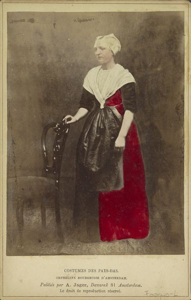 Curator: Good morning. Let's explore this gelatin silver print. The photographer is W.G. Kuijer & Zonen, and it's called "Portret van een onbekende jonge vrouw in klederdracht", placing it somewhere between 1885 and 1906. What are your first thoughts? Editor: It’s melancholic, isn’t it? A poised stillness, yet a longing hangs in the air. The limited tonal range really amplifies that muted feeling. Curator: Indeed. The subdued palette directs our attention straight to the formal composition: the young woman seated, a book held delicately in her hands, a small table with ornaments adding depth to the frame. Consider the cultural context too—it’s an ethnographic study of traditional dress. Editor: Exactly! Her attire becomes this powerful signifier. That bonnet, the high-necked dress… they speak to specific communities and a bygone era, frozen by the camera's gaze. Is she performing a role, or is this genuine? Curator: That’s the fascinating ambiguity of these kinds of portraits. On one hand, they're products of studio conventions; on the other, each person subtly resists that constraint. The averted eyes suggest vulnerability beneath the surface, perhaps revealing a hidden yearning. Editor: And isn’t it funny how our contemporary reading interprets this almost as “street style”? The historical context provides the structural frame through which we filter, and the print now almost acts like a sartorial "time capsule" in a bizarre meta-cycle. Curator: Absolutely, and there is so much one could elaborate here on the relation between past, present, cultural identity and visual media... Ultimately, it serves as a prompt, nudging us to contemplate not only the young woman, but photography itself. Editor: I like that a lot! Well said—a photo within an aura that begs so many further questions about what and how we gaze. It gets to stay with you, like a fleeting impression.