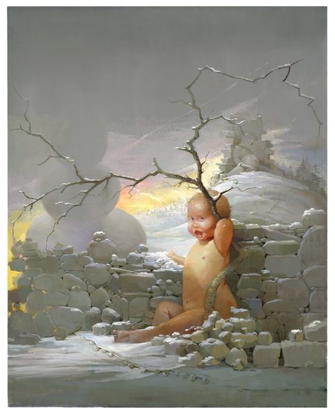 Curator: This is Lisa Yuskavage’s “Drag,” created in 2007 using acrylic paint. The canvas presents a rather enigmatic, unsettling scene of two figures in an unusual landscape. Editor: Whoa. My first impression? It's like a fever dream you can't quite shake off. There’s something vulnerable yet defiant about those figures, shrouded in this almost eerie peach-tinged light. Are they lovers? Sisters? Is this about a literal drag performance? My mind is doing cartwheels. Curator: Yuskavage's work often navigates complex territories of desire, sexuality, and power. The title itself, "Drag," points to the idea of assuming a role, perhaps even a burden. It may hint at the ways societal expectations weigh upon individuals, especially women, in the construction of identity. Editor: That’s interesting… "Drag" can be a weight. There’s something deeply interior happening here, almost painful, even if the composition and the pastel hues lure you into this sense of otherworldly softness. They both look vulnerable, or resigned, or maybe even powerful despite being vulnerable, sitting together on an edge between two planes or times. Curator: Absolutely. There’s a sense of performance inherent in the tradition of nude portraiture, a push and pull between objectification and agency that Yuskavage actively explores. Looking at other examples of Yuskavage’s work, you can also see how she pulls from distinct historical references to further reinforce certain political dynamics. Editor: Exactly! And that raw, vulnerable edge to these figures makes them undeniably present, like they’re staring straight back, and the surreal surroundings create an unease – almost a threat of being absorbed by some larger, inscrutable, power. Is it all internal, I wonder, this dreamscape… or is it the literal landscape that poses this weight? The pale palette feels dangerous to me somehow. Curator: Perhaps the figures and the strange landscape underscore the cultural weight imposed upon the female body throughout history, yet also speak to the contemporary moment. Editor: Thinking about this work, the performance, vulnerability, and cultural narratives, makes it feel quite current and yet somehow… timeless. What an incredible pull to experience.