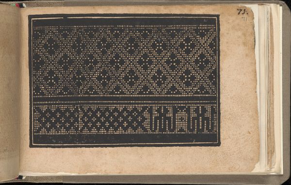 This is a page from "Schön newes Modelbuch" by Sigismundus Latomus, likely created in the early 17th century. Notice how the stark contrast of black ink on the light paper creates a striking visual rhythm. The composition is divided into three distinct horizontal bands. Each band features a unique pattern, meticulously crafted from a grid of squares, and the artist plays with positive and negative space to define the motifs. Look closely at the top band, the intricate geometric design suggests an exploration of complex symmetry and repetition. The middle band introduces a curvilinear element, softening the rigidity of the grid with its swirling patterns. Finally, the bottom band presents a series of rounded shapes, creating a sense of continuity and flow. Through careful arrangement and manipulation of simple geometric forms, Latomus transforms the two-dimensional page into a fascinating study of pattern and form. This piece destabilizes the traditional notions of artistic expression and engages with new ways of thinking about space, perception, and representation.