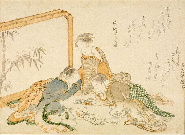 Curator: This is "Women and Child Watching Manzai Dancers," a print by Kubo Shunman, dating back to the late 18th century. It depicts an intimate performance scene. Editor: There’s a wonderful asymmetry to the composition; the dancers are energetic and the viewers are more subdued, creating an interesting tension. Curator: Shunman was working during a time of social and cultural upheaval in Japan. The Manzai dance, traditionally performed during New Year, was seen as a celebration of communal joy. This print suggests an interesting dynamic between performers and audience. What do you make of that? Editor: The women, seemingly of different classes, are observing this spectacle, which brings up questions of access and social status. Who has the privilege to enjoy this cultural moment? Curator: Indeed. Shunman uses this scene to subtly explore the social fabric of his time. Editor: It also reminds us that art can reflect and shape our understanding of society's inequalities. Curator: That's a valuable point to remember as we consider Shunman's work today.