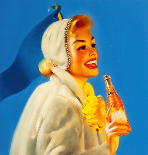 Editor: This is Haddon Hubbard Sundblom’s Coca-Cola ad illustration from around 1940, an oil painting portraying a woman holding a Coke bottle. There's something very idealised about her… pristine almost. How do you interpret this work? Curator: I see more than just a simple advertisement. This image is deeply embedded within the social and political currents of the 1940s. Consider the context: World War II was raging, and commercial art was mobilised to boost morale and project an image of American prosperity and cultural dominance. Does the painting's style – its clean lines, vibrant colours, and idealised depiction – speak to this? Editor: It definitely feels very optimistic and, I suppose, like it's trying to evoke a sense of normalcy during a turbulent time. Curator: Exactly. Now, let's delve deeper into the gender dynamics. Who is this woman? She represents an idealised version of femininity which tells a lot about the expected roles for women, not only in the workforce but also regarding how they must act and look. Do you see how she's both subtly powerful and seemingly domestic? It is an intersection of aspiration and cultural prescription. Editor: So it's reflecting the complex position of women during that period? The subtle tensions are certainly visible once you consider those perspectives. Curator: Precisely. And let's consider Coca-Cola itself. Its global expansion was concurrent with America's rise to power. It can be viewed as soft power, with commercial symbols intertwined with notions of national identity. Can this painting tell a bigger story than the company intended? Editor: Definitely. It's fascinating to see how much an everyday ad can reveal about society’s underlying values. Curator: Right? Thinking critically about the imagery we see, it's imperative to question everything we perceive at face value. Editor: Thanks! I now realize it embodies much more than a simple commercial illustration.