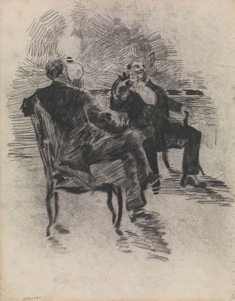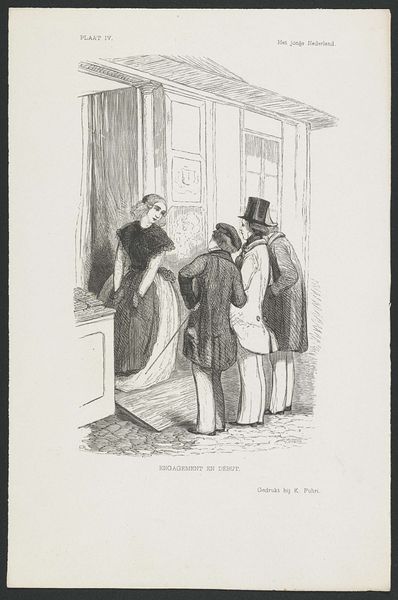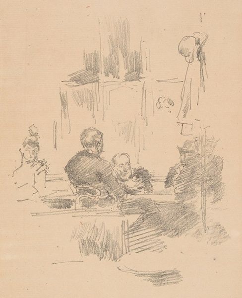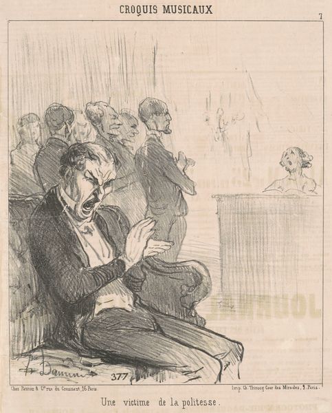 Curator: Alright, let's turn our attention to a work by Honoré Daumier. This lithograph, tinted with color, is titled "A Victim of His Own Politeness," and it comes from his series “Croquis Musicaux” published in 1852. Editor: My initial impression is one of theatricality and irony. The dramatic figure in the foreground—is he applauding or in agony? There’s a tension created by the extreme expression on his face, which almost seems to clash with the formal setting. Curator: That's precisely the genius of Daumier. He was a master of social commentary, using caricature to critique the bourgeoisie. Notice the rows of faces behind our "victim," each subtly conveying a different form of polite boredom or disinterest. Daumier highlights the hypocrisy of forced enthusiasm in social settings. Editor: I’m struck by Daumier's use of line. Look at the loose, sketchy quality, particularly in the background figures. The swift, almost frenetic marks add to the sense of unease and repressed energy within the scene. The coloring too, thinly applied, intensifies the overall mood. Curator: Absolutely. Daumier created these lithographs for mass circulation, primarily through newspapers and journals. The immediacy of the lithographic technique allowed him to respond quickly to social events and trends. "A Victim of His Own Politeness" speaks to the larger anxieties around social performance in 19th-century France. Editor: The composition cleverly draws the eye from that flamboyant figure in the chair, back through the muted audience, right to the performer herself—rendered with the lightest touch, almost an afterthought. Is that deliberate undermining, a formal declaration about performance being secondary to societal appearances? Curator: I think so, it certainly aligns with Daumier's broader project of exposing the superficiality of bourgeois life. The "victim" isn't reacting to the music; he’s performing for his peers. His politeness, feigned or not, becomes a kind of prison. Editor: Thinking about line, shape, and compositional balance brings me back to the power of simplicity, using seemingly rushed strokes to highlight Daumier's statement of 19th century societal expectations. It also proves that simple art, when done thoughtfully, can deliver strong emotional cues and commentary. Curator: It's a potent reminder that art often functions as a mirror, reflecting the values and contradictions of its time. It gives pause to reflect on these same behaviors, perhaps still very alive in present day.