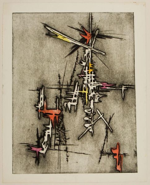 Gabor Peterdi made this intaglio print, 'Sunken Treasures', in 1952, and when I look at it, I imagine a hidden world, maybe even one under the sea. The surface has this amazing scratched texture, the lines are almost like scars, and they seem to want to uncover something. There's a tension between the grey, almost metallic background and the flashes of color – red, yellow, purple – that feel like glimpses of something alive and glowing. The white shapes remind me of bones or maybe the skeletons of buildings, things that time and water have transformed. There's a cluster of spiky lines on the left that could be an oil rig, or just a weird sea creature. The contrast reminds me of what Guston was doing in the late sixties, when he came back to figuration through abstraction, it's like an archeological dig, one that reveals the strange beauty of decay and the secrets that lie beneath the surface.
