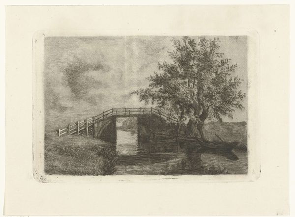 Editor: So, this is "Kanaal bij de poort van Nimy," an etching and engraving by Léon Dolez, sometime between 1875 and 1878. It feels…almost melancholic to me. A little forgotten, maybe? What strikes you about it? Curator: Forgotten...yes, that's a lovely way to put it. The scene itself has this quiet, almost eerie stillness. It's as if time itself is holding its breath. What's fascinating to me is the artist’s choice of perspective. We’re looking straight down this man-made channel, with these fortress-like walls on either side. Feels a bit like peering into a lost world, doesn’t it? Almost like a stage set waiting for a drama that never arrives. What do you think? Editor: A stage set...that's interesting. I was so focused on the dreariness that I hadn't really considered that theatrical aspect. The repetition of those little trees in the distance almost gives it a sense of forced perspective, like in a play. Curator: Exactly! It’s as if Dolez is whispering, "Look closer. What secrets does this landscape hold?" And that light! Have you noticed how it falls? A wash of soft greys… the light seems almost to emanate from the water itself. As if the water holds secrets too. Does that evoke a sensation or idea for you? Editor: Definitely the secrets part, that makes me want to know what existed where this place is now. Curator: And isn’t that the magic of art? To make us look at the mundane, at a forgotten corner of the world, and suddenly find ourselves filled with questions? Editor: I guess it is. I came in thinking "blah, old print," and now I want to research the history of Nimy and see what's there now. Curator: And that, my friend, is why we keep looking. There’s always another layer, another question, another whisper from the past just waiting to be heard.