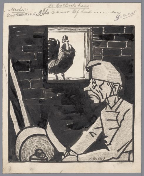 Editor: Here we have "Troelstra en Nolens in het ziekenhuis," dating roughly between 1900 and 1930, a pen and ink drawing. The style is reminiscent of early modernism. I'm struck by the starkness of the lines and the candid portrayal of what seems like a very private moment. How does this image speak to you? Curator: It's interesting to consider this piece through the lens of its social and political context. Troelstra and Nolens were both prominent figures in the Dutch socialist movement. To see them depicted in a hospital setting suggests a vulnerability that contrasts sharply with their public image as political leaders. How does the artist use the setting of the hospital to shape our perception of these men? Editor: I see what you mean. The hospital becomes this stage where their power is diminished, and they are simply…men. Do you think the artist is making a comment on the nature of power itself? Curator: Precisely. Genre paintings, especially caricatures like this, often served as social commentary. Consider the role of medical institutions in shaping social norms and power dynamics. This image prompts us to question the relationship between personal experience and political agency, and to see how illness, like other shared human experiences, can level social hierarchies, at least temporarily. Notice how their names are subtly inscribed—are they still recognizable despite their vulnerability? Editor: Yes, definitely recognizable! The artist ensured their identities remain clear. It's like a reminder that even in their weakened state, their influence persists. Curator: It also reflects the rising power of the press and the increasing fascination with the private lives of public figures at the time. Editor: That's fascinating. I hadn’t considered that aspect of public perception. It makes me see this artwork as a record of the moment and of something more - the changing relationship between public figures and the citizens that they lead. Curator: And perhaps, a commentary on the human condition itself.