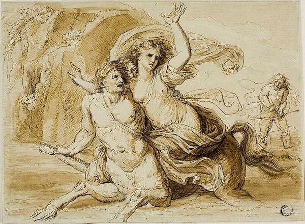 Thomas Sully created this watercolor painting, Three Classical Figures, sometime between 1800 and 1872. The artist employed traditional materials, such as paper and watercolors, showcasing the fluidity and transparency inherent in the medium. Sully's application of thin washes creates a luminous effect, emphasizing the soft contours of the figures. The delicate brushwork captures the drapery and flesh tones, and the color palette is limited to earthy browns and skin tones. This piece exemplifies Sully's mastery of watercolor techniques, as he skillfully manipulates the medium to evoke a sense of classical elegance and grace. By prioritizing the tactile qualities of the paint and the way light interacts with the paper, Sully elevates a seemingly simple composition to a level of artistic sophistication. The artist draws on aesthetic values inherited from the Renaissance. The artist engaged with classical ideals of beauty, further blurring the boundaries between craft and fine art.