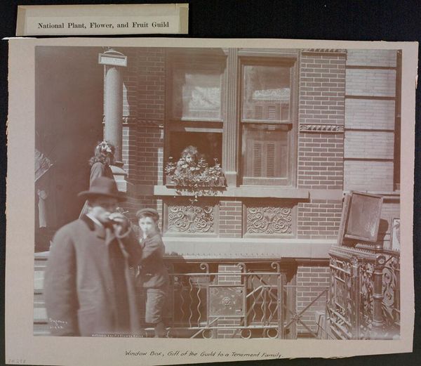 Editor: So, here we have a gelatin silver print, titled "Mannen en vrouwen bij een woning," which translates to "Men and Women by a House," made sometime between 1900 and 1910 by G. Hidderley. The subjects look quite formal, and almost a little stiff, standing there. I am curious, how do you interpret this work, seeing it through your eyes? Curator: It feels almost like stepping into a faded dream, doesn't it? The gelatin silver print lends this beautiful, soft focus that hints at a past only partially remembered. To me, it evokes a sense of stillness, a frozen moment in time. Note how the vine-covered building almost cocoons them – does that say something about a cloistered, domestic life? Do you get the sense they're performers in a tableau of family life? Editor: A tableau, yes, that is precisely the word that I was searching for. They are staged, almost unnaturally. It is as if this photograph captured a performance. But the vine-covered house... Is that maybe trying to imply something? Curator: I feel that it whispers about growth, and nature reclaiming the domestic space, or vice-versa. There is that sense of life, slowly creeping across something solid. And note, in that moment captured, their world, everything seems rooted. The bicycle feels a quirky addition, perhaps an echo of progress in a picture of a more genteel life. Editor: Now that you mention the bicycle, it suddenly looks so modern compared to their attires. They feel fixed in a certain period, but it appears as if it's peeking through, too, doesn't it? Curator: Precisely! A gentle prodding, to disrupt that quiet facade. Isn't it wonderful how a simple image can hold so many potential stories? A bicycle can spark new meaning. It makes one wonder, doesn't it, what other hidden gems lie within the ordinary moments we capture? Editor: Definitely. I'll look at group portraits totally differently going forward.