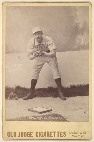 Editor: This albumen print from 1888, a baseball card featuring Visner, a catcher for the Brooklyn Bridegrooms, is intriguing. It seems almost accidental, a quick snapshot in time intended to sell cigarettes. What stands out to you about this piece? Curator: I find the inherent contradiction fascinating. We have a supposedly mass-produced object, a tobacco card, attempting to capture an individual, Visner, within the burgeoning industry of baseball. The "Old Judge Cigarette Factory" blazoned across the bottom speaks volumes about the confluence of advertising, leisure, and labor in late 19th-century America. Editor: So you’re focusing on the context in which it was produced. Curator: Precisely. Consider the material itself, the albumen print. What were the labor practices involved in its making? How many hands touched this image before it reached a collector? What kind of consumption cycle does this represent? The fact that photography, which originally held promise to deliver faithful representation, here serves the industry selling addiction… What do you think of the seemingly simple, yet staged and somewhat clumsy pose of the player? Editor: That's a good point about labor. His awkward stance adds another layer, highlighting perhaps the manufactured nature of the image itself, the gap between reality and its presentation. And I agree, using albumen prints seems almost archaic for mass consumption. Curator: Indeed! The very choice of this medium speaks to a transitional period, where old technologies were harnessed for new modes of production and consumption. Are the cards promoting baseball or is baseball promoting tobacco? What is the actual subject, do you think? Editor: This conversation is opening my eyes. I hadn't really considered how the means of production and the object being sold are so intrinsically linked. I now think the subject isn't simply Visner, but how he represents this complex interplay of labor, leisure, and commercialism at the turn of the century. Curator: Exactly! Looking at the materials and their context can often unlock richer interpretations of art.