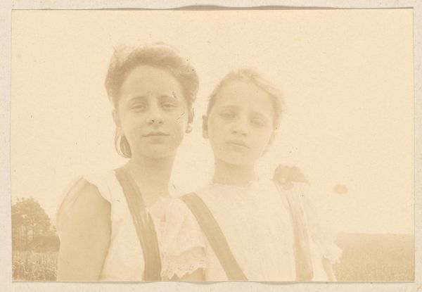 Curator: This photographic print, entitled "Portrait of Lovis Corinth," was captured sometime between 1918 and 1928 by Hugo Erfurth, an artist deeply embedded in the New Objectivity movement. Editor: Mmm, sepia-toned melancholy. They appear connected by suspenders of some sort. Like little workers holding up a landscape. Curator: You noticed the landscape! Yes, Pictorialism sought to elevate photography to the status of fine art. Erfurth here almost paints with light and shadow, softening the photograph so that the landscape appears dreamlike and the sitters, mythic. It certainly departs from straight documentary photography. Editor: Mythic! Yes! I think the symbolism works in multiple ways here. On the surface the two girls hold up their rural life, perhaps, which needs tending. Underneath, one wonders what those lives are actually built upon… what beliefs, or memories, maybe secrets. It is difficult to disentangle how culture assigns these. Curator: And that disentanglement is a lot of what Pictorialism engages with, doesn’t it? The soft focus wasn't accidental. It represents more than a lack of sharp lines; it symbolizes memory, nostalgia, and the weight of unspoken narratives within these types of familial poses. We may all share something visually and genetically but have separate memories and interpretations of each other. Editor: Right. And also, Erfurth knew a famous portraitist himself! Lovis Corinth who's work focused so much on symbolism as well as capturing the weight of the body and expression... He had probably something of Corinth's sensibility embedded. Curator: Indeed. The visual echoes in his own photographies resonate across artistic movements. To bring it all together… photography offered an invitation into that tension. I suppose the very fact that we're still discussing its emotional and historical depth is a testament to its resonance, still rippling almost a century later. Editor: Exactly. Each time the portrait appears anew the narrative can shift depending on the needs of the culture that's witnessing. Always changing.