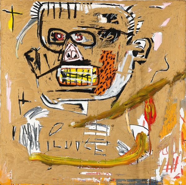 Curator: The mixed media piece before us is Jean-Michel Basquiat’s “In This Case,” created in 1983. Acrylic and what looks like oil stick on canvas. It's really quite monumental. Editor: Immediately, the overwhelming color strikes me—the vibrant red feels almost violent. And those teeth, outlined in green… It’s quite unsettling. Curator: Consider the layering. Basquiat frequently built his compositions this way. The frenetic energy comes from a constant building up and scraping away. You see the raw canvas poking through. Note also his use of language within the piece; observe the lone crown hovering above the subject as well. Editor: Yes, but who *is* this subject? The raw materiality echoes the rawness of the figure depicted—or rather, evoked. Basquiat is wrestling here with complex themes of Black identity and trauma. The fractured anatomy, the exposed teeth, all speak to a deeper cultural anxiety, perhaps even referencing historical representations of Black bodies. Curator: Precisely. Think about Basquiat’s place in the art world at the time, his rapid ascent, his commercial success within a predominantly white space, and how this impacted his creative process. There's a tension between raw, authentic expression and the pressures of production. He used readily available materials. And this piece uses those raw materials in that raw expression that feels honest and real. Editor: Absolutely. And the crown symbol becomes crucial. Here, it acts almost sardonically, highlighting issues of power, appropriation, and perhaps even the artist's own complex relationship with fame. Curator: The art market often celebrates the 'genius' artist. It’s essential we acknowledge the labour involved – the application, the mark-making, the very physical act of creation. Editor: This artwork demands more than passive observation. It's a visceral scream. This is Basquiat holding a mirror to society and asking uncomfortable questions. Curator: It's a testament to the power of materials in conveying complex narratives. Editor: Yes, this isn't merely art for art's sake, but art as a form of cultural critique. Powerful stuff.