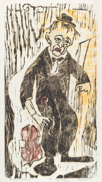Curator: This print, created in 1956, is entitled “Mime” by Stella Drabkin. It appears to be made from coloured pencil. Editor: My first impression is the tension. The figure seems to be reaching for something, or perhaps recoiling. The high contrast spotlights the figure's isolation in a dramatic and shadowy space. Curator: Indeed, the use of coloured pencil emphasizes this inherent conflict, with its combination of vibrant and desaturated areas. The almost frantic quality of the medium contrasts strongly with the controlled lines. Editor: Mimes often present a subversive kind of public performance. Does Drabkin perhaps mean for us to ponder a public persona versus a private one? Is the figure’s exaggerated appearance a social commentary on theatricality and societal roles during the 1950s? Curator: From a formal perspective, consider how the upward diagonal of the body creates an unsettling compositional imbalance. His slightly awkward posture and hand gestures highlight the precariousness of this performance. The artist plays with our expectations of a "true" mime; instead, we get something more disturbing. Editor: I wonder if the muted colours Drabkin has used work to create the sense of looking back into the past? In a way, the mime's theatrical persona becomes both deeply individual and highly representative of an era obsessed with image and spectacle. Perhaps we are invited to think about our role as an audience. Curator: Yes, his painted-on facial expressions and upturned gestures contrast with a subtle underlying sorrow that undermines the playfulness. Editor: Thinking about the history of performance traditions, the choice of a Mime figure provides powerful reflections on performance culture itself. This encourages discussions about self-expression within a society that often encourages conformity. Curator: Exactly, focusing on such intricacies certainly brings fresh and interesting perspective on this artist's craft. Editor: Reflecting on this Mime, one is left to ponder not only art, but our lives as constantly acted and viewed stories.
