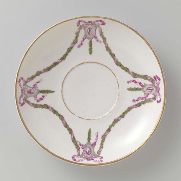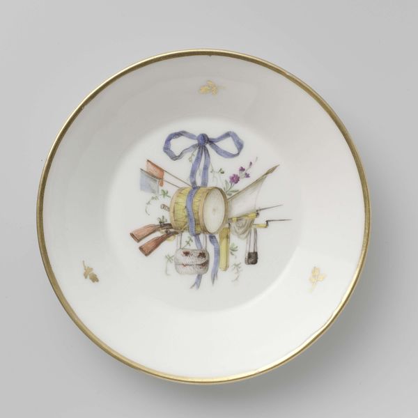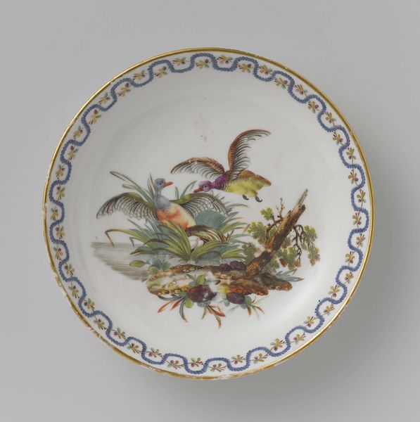 Editor: Here we have a Loosdrecht plate from around 1778-1782, currently residing at the Rijksmuseum. It features delicate watercolour painting. The bird at the center gives a charming and ornate feel, something akin to Rococo. What stands out to you about the visual elements of this piece? Curator: Initially, the balance—or perhaps the studied imbalance— strikes me. Note the centralized, though slightly off-center, placement of the avian subject. This creates a tension that's further complicated by the curvilinear ornamentation around the rim. The lines don’t fully resolve themselves into predictable patterns. Do you notice how that edge pattern avoids mirroring, favouring instead subtle shifts and variations? Editor: I see what you mean about the imbalance now; it's not perfectly symmetrical! It's as though the design elements flirt with conventional order but always pull back at the last moment. Curator: Precisely! Consider also the interplay between the sharp rendering of the bird itself and the somewhat looser rendering of its perch and surrounding flora. There is intentional tension embedded in the materiality. What we observe is not simply a decorative item; it’s an essay in contrasting modes of representation. How does that inform your understanding of the piece? Editor: That's fascinating; I had assumed the asymmetry was accidental. I see now how this tension gives the piece a dynamic quality. Curator: The Rococo embraced asymmetry, but here it moves beyond mere decorativeness; the plate challenges the idea of idealized, symmetrical beauty. It highlights a sense of controlled dynamism through its material and design choices. Editor: This was eye-opening. I initially took it as a simple decorative object, but focusing on the elements and the way they are in conversation makes me see its complexity. Thank you! Curator: My pleasure. Visual art offers multiple perspectives, each enriching our understanding.