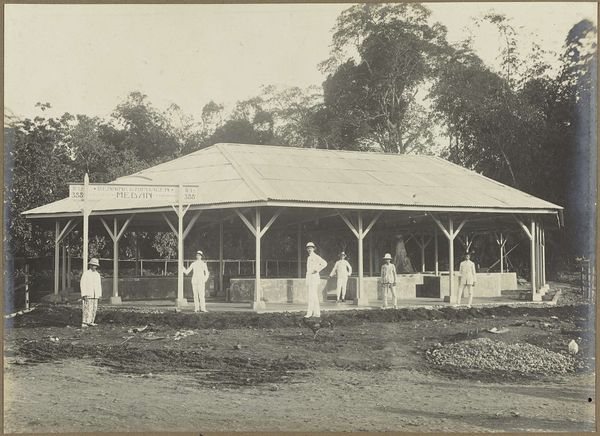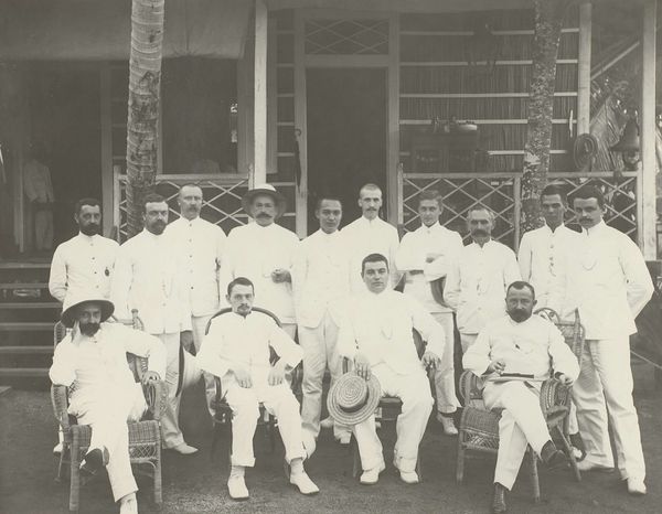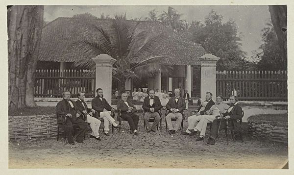 Editor: Here we have "Sociëteit" by Woodbury & Page, dating from 1863 to 1869, a gelatin silver print. It's a fascinating glimpse into the past. The men are formally dressed and seem relaxed, yet there is a underlying sense of tension. What's your interpretation of this work, considering the context in which it was created? Curator: This photograph offers a window into the social structure of colonial Java. These men, likely Dutch administrators and businessmen, represent the power dynamics inherent in the Dutch East Indies. Consider the setting – a leisurely gathering on a veranda. It speaks to privilege and control. Note the division: formally dressed men at leisure, while others stand in the background, almost as observers. Editor: So you're suggesting the photo reveals the social hierarchy? Curator: Precisely. It subtly portrays who holds authority and who is relegated to the periphery. Think about who commissioned this image, and for what purpose? Photography was becoming more accessible, so was this intended to document, celebrate, or perhaps even subtly promote the colonial lifestyle? Editor: It's interesting how seemingly casual details, like the seating arrangement or the types of clothing, become signifiers of social standing. The dog in the foreground – what does that imply, if anything? Curator: Consider how such details contributed to constructing and reinforcing a specific image of colonial society – one of order, civility, and European dominance. Even the seemingly benign presence of a pet serves to reinforce a particular idea of domesticity and control over the landscape and its people. What's your feeling about the way that light functions in the photograph? Editor: Now that you mention it, the shadows create depth, and a certain gravity that anchors the scene. The interplay of light and shadow definitely accentuates the serious nature. I see so much more to this piece now! Curator: And hopefully recognize how historical context dramatically shapes our interpretation of even a simple photograph.