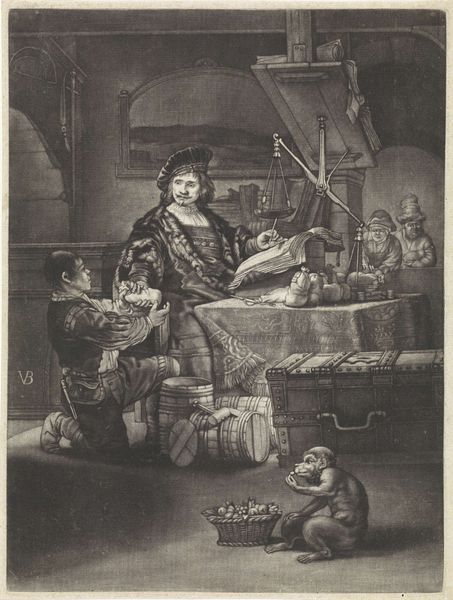 Rembrandt van Rijn created the etching "Wittenboogaert, The Gold Weigher," a work dense with detail achieved through intricate line work and tonal gradations. This small print invites a consideration of wealth, morality, and the artist's own relationship to societal structures. Rembrandt employs a complex interplay of light and shadow, using dense hatching to create areas of deep darkness and leaving other areas almost untouched to suggest highlights. This contrast brings a dramatic quality to the scene, emphasizing textures and the weight of objects. The composition directs our gaze from the lower left, where a chest suggests worldly possessions, upwards to the figure of Wittenboogaert, who sits amidst symbols of his trade. A semiotic reading reveals the scales as a sign of justice and the balance between material wealth and ethical behavior. The scene is more than a straightforward depiction; it questions the value we place on material wealth, prompting reflection on the balance between earthly and spiritual riches. Rembrandt's mastery of form elevates this modest print to a complex narrative, inviting endless interpretation.