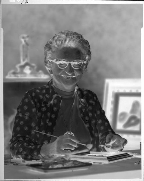 Curator: This is an untitled photograph by Lucian and Mary Brown, currently held at the Harvard Art Museums, showing a young girl ironing. Editor: The high contrast and tight framing really draw me to the figure's determined focus. It's a study in light and shadow. Curator: Precisely. These Browns were interested in childhood as a period of social conditioning, often photographing children engaged in domestic tasks. The performative aspect of gender is very palpable here. Editor: I see it more as the dance of the light and the lines of the ironing board mirroring the pattern of her dress. Curator: True, but the work also hints at the socio-economic realities of mid-century America and gendered expectations. Editor: Perhaps. But for me, it’s primarily the sharp details against the blurred background that make it compelling. Curator: Ultimately, it is the interplay between social context and formal qualities that makes the artwork so stimulating to discuss. Editor: Agreed. Whether it’s society or light, there's plenty to see.