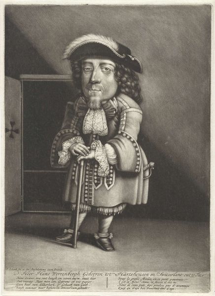 Curator: Here we have Jacob Gole’s “Portrait of John Skinner,” an engraving dating from between 1670 and 1724, residing here at the Rijksmuseum. The Northern-Renaissance lines create a fascinating…oddity. Editor: Yes, oddity is right. My initial impression is one of distortion. The proportions feel intentionally skewed, making it… almost satirical, yet dignified in its presentation. The formal Baroque elements clash wonderfully with the exaggerated caricature. Curator: Observe the impeccable line work, though. The engraving style lends a certain formality. Notice how the cross-hatching defines the volumes and textures, particularly in the intricate details of his clothing and the feathered hat. The stark contrast creates visual interest that leads your eye throughout the composition. Editor: Absolutely. The engraver emphasizes the small man standing near a diminutive open cabinet through exaggeration, creating visual metaphors for perceived self-importance and societal pressures. He's meticulously dressed, but the symbol of the sword hints at hidden vulnerabilities. Is there an unspoken commentary here about societal roles? Curator: I think your emphasis on societal critique is warranted, given this style emerged out of earlier moralizing traditions. This image employs symbolism and visual cues rooted in those. The use of the figure, while exaggerated, serves the broader structure, where each element, from the stance to the lighting, plays into a sophisticated dialogue of form. Editor: It makes me consider our relationship with images and how even something centuries old can evoke such potent reactions. In his time, this was considered acceptable. Has he achieved a lasting recognition or even infamy in our age? Curator: By distilling this individual to near geometric forms, the artwork transcends time and allows this… "little" fellow to resonate. Editor: It’s been enlightening to consider “John Skinner” through our distinct, but converging, lenses. He stands as both historical record and as an image embedded with enduring human qualities.