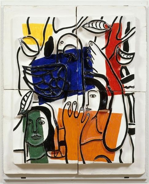 Editor: We're looking at Fernand Léger's "Dance," painted in 1942 using acrylic paint. The figures and geometric shapes almost feel like a playful collage. How do you interpret the interaction between the line and the color planes within the piece? Curator: Indeed, the formal interplay here is crucial. Note how Léger employs black outlines to define figures, objects, and abstract shapes alike. These lines act as armatures, giving structure and distinctness to the forms. Observe the tension created where these lines intersect with blocks of pure color. The blue, yellow, red, and green areas aren’t merely background; they possess equal visual weight, challenging traditional figure-ground relationships. Editor: It's interesting that you mention the weight of the background. Does the flatness enhance a sense of movement? Curator: Precisely! Léger sacrifices depth and volume, emphasizing the two-dimensionality of the canvas. This flatness, coupled with the dynamic arrangement of forms and the vibrant color palette, paradoxically animates the composition. The eye jumps from shape to shape, tracing the black lines in a restless dance across the picture plane. Ask yourself, is it really a depiction of "dance" or an experiment with rhythmic visual elements? Editor: So, the title itself might be less about the subject matter and more about the viewing experience. That changes how I see it entirely! Curator: Exactly. By attending to the internal mechanics of the painting, we gain insight into Léger’s broader artistic project, his commitment to abstracting reality into essential, almost industrial forms. It’s not just what it depicts, but how it's put together, that conveys meaning. Editor: I'm starting to understand the power of dissecting the formal components, it unlocks new dimensions. Thank you! Curator: A fruitful approach to art lies precisely there, in examining its intrinsic structural elements.