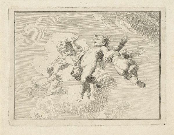 Jacob de Wit created this monochrome drawing, titled 'Mercurius Stealing Venus's Belt,' using pen and gray ink, likely as a preparatory study. De Wit, working in the Dutch Republic during the 18th century, specialized in ceiling paintings, a popular form of interior decoration among the wealthy. The image shows a scene populated by classical figures, a popular subject matter at the time, depicting the Roman god Mercury stealing the girdle from Venus, the goddess of love and beauty. In the historical context of the Dutch Republic, which had a powerful merchant class, classical imagery was frequently used to symbolize wealth, power, and cultural sophistication. However, here, Venus's vulnerability asks us to consider the dynamics of power and gender within these narratives. What does it mean to depict a goddess in a moment of vulnerability, and what does it say about the society that consumed these images? Ultimately, this drawing invites us to consider the complex interplay between mythology, gender, and power.