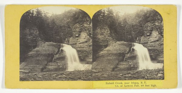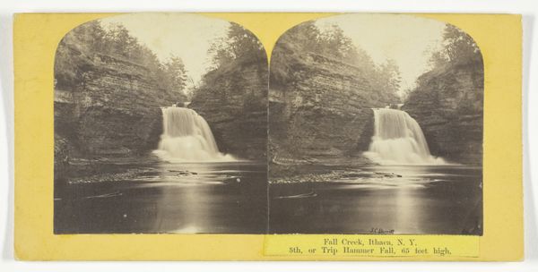 This stereograph card shows a view of Fall Creek in Ithaca, New York, and was produced by J.C. Burritt in the late 19th century using two nearly identical photographs mounted side-by-side. Stereographs like this one were popular forms of entertainment and education in the mid-to-late 1800s in the United States. Viewing them through a stereoscope gave the illusion of a three-dimensional image, which was a novelty at the time. They provided people with access to distant places and events, contributing to a sense of shared visual culture. The popularity of stereographs coincided with the expansion of photography as both an artistic and commercial medium. Institutions like photography studios played a key role in shaping public taste and documenting American life. Understanding the history of photography and its impact on visual culture helps us better understand the social context in which this stereograph was produced and consumed.