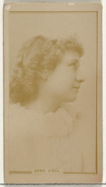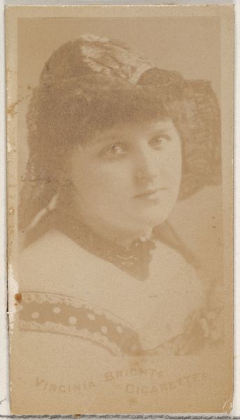 Editor: Here we have a promotional card from 1890 created by the Kinney Brothers Tobacco Company, part of their "Actresses" series, featuring Alice Lanson. It’s a photographic print, a simple portrait really, but there’s a certain elegance in the tonal range and the way her pearl necklace catches the light. What elements stand out to you in terms of form? Curator: Precisely. Notice how the artist manipulates light and shadow to sculpt Lanson's face. The soft focus around the edges, achieved through photographic techniques of the time, creates a gentle halo effect. This immediately draws the viewer's eye to the sharper details of her face. How does this controlled focus guide our perception of the subject? Editor: I see what you mean! The slightly blurred edges really do emphasize her face, and I hadn’t consciously registered that before. The tight crop contributes, too, creating a sense of intimacy. Is it that intimacy and detail that separates it from other kinds of portraits? Curator: Certainly, that close-up framing impacts our perception of this subject’s expression, compelling the viewer to examine her countenance carefully. Consider, also, how the repeating circular motifs—the pearls, the curls of her hair, even the roundness of her face—create a sense of harmony. This structural repetition adds visual cohesion to the overall composition. The details create rhythm, too. Do you find the composition draws you to her eyes? Editor: Yes, the arrangement does emphasize her eyes, making them quite captivating. Thanks for walking me through that formal reading of the portrait; I definitely see the structural elements you are describing more clearly. Curator: Understanding an artwork's composition and structure is key to grasping its overall aesthetic impact. Reflecting on this has sharpened my insights into the visual techniques employed in late 19th-century portraiture.
