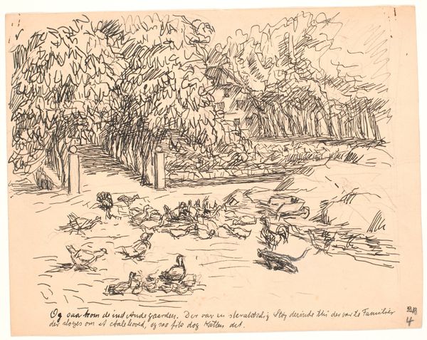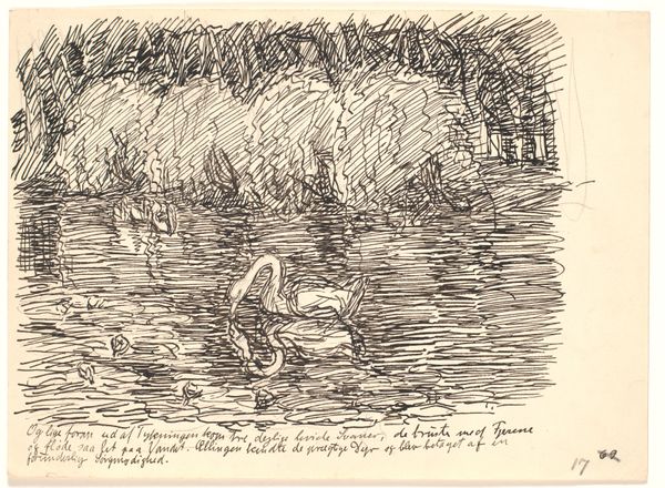 Curator: Fritz Syberg created this pen and ink drawing, titled "Da følte den sig ganske undseelig..." in 1928. It's currently held at the SMK, the National Gallery of Denmark. Editor: The initial impression is one of peaceful melancholy. The swan, almost a blur of white against the darker water, looks incredibly isolated. There is some very deft pen work, I can make out textures in the reeds that makes me wonder how they feel. Curator: That sense of isolation is quite resonant, particularly when considering Syberg's broader artistic trajectory. He experienced a great deal of personal turmoil throughout his life, including financial struggles and the death of his first wife. These burdens no doubt shaped his outlook and his artistic expression. The cultural impact of this drawing shows that grief never ends. Editor: Symbolically, water often represents the unconscious, the emotional realm. The swan, with its neck curved, is positioned directly in its own reflection and reminds me of narcissism or navel-gazing, in the Freudian way. Is he confronting something within himself, or perhaps lamenting what he sees? Curator: The deliberate choice of stark, almost brutal linework here stands in contrast to the grace we normally associate with swans. It is certainly possible that his subject's emotions mirrored what he felt inside. The marks hint at instability and the social landscape in flux, following WWI. Syberg belonged to a generation grappling with unprecedented societal changes. Editor: That rawness certainly emphasizes the swan's vulnerability. But it is quite a common, powerful animal, maybe even with colonialist implications, given their British monarchical ties. Looking at Syberg's work now, it’s not only a personal statement, but a reflection on how such cultural forces could create deep feelings of being undermined. Curator: Well, beyond the purely personal experience, you’re definitely highlighting that this simple swan takes on social and symbolic meanings. His artistic exploration can provide deeper understandings of selfhood in the face of societal demands. Editor: This discussion really prompts me to revisit Syberg's wider body of work with a more nuanced eye, appreciating the layering of emotional expression. Curator: And for me, it emphasizes the significance of art as an avenue to discuss not just beauty, but societal concerns too.