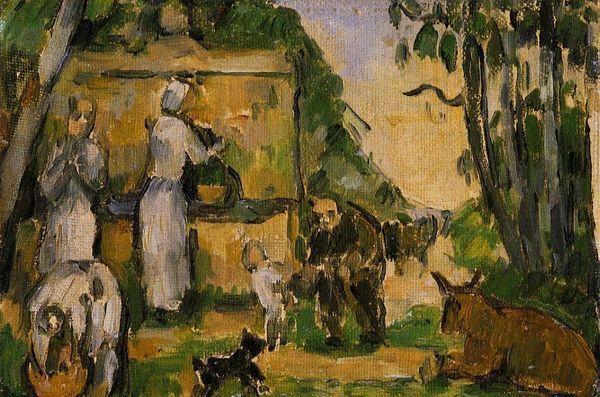 Editor: Here we have Paul Cézanne’s “Life in the Fields,” painted in 1875 using oil on canvas. There's almost a hazy feel to it, a bit dreamlike even. What do you see in this piece? Curator: I see a loaded image, particularly if we unpack the social and historical context of 19th-century rural France. Cézanne captures a seemingly idyllic scene of labour, but how might we read this through the lens of class and gender? Consider the weight, quite literally, on the woman carrying water – the representation of labour as gendered experience. Editor: I hadn’t thought about that. It’s easy to get caught up in the impressionistic style and miss the social commentary. Curator: Exactly. And notice the figures that are included in the painting and how their relationship to the land may signify their status. Even the brushstrokes themselves become a means of exploring inequality - do you see how some areas appear unfinished or rougher than others? This invites questions about who has the privilege of leisure versus who is bound to the fields. Editor: Now I notice how some figures are barely rendered, almost fading into the landscape itself. Is Cézanne suggesting something about their visibility, or lack thereof, within society? Curator: Precisely! This invites a deeper exploration into themes of representation, labour, and social structures. Think about who gets to be seen, and whose stories often remain untold. What is romantic, and who is missing from view? Editor: I had not considered a post-impressionist painter to address social class issue, but your interpretation has added to my appreciation of what painting is about. Thank you! Curator: My pleasure! Looking at art through different theoretical frames always makes it relevant for our time.