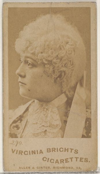 Curator: The work before us, dating from 1890, is entitled "Miss L'Hery, from the Actresses series." It's a photographic print, a trade card actually, issued by Kinney Brothers to promote Sweet Caporal Cigarettes. Editor: It feels like a whisper from another era. All those soft curves and that big bow, viewed in profile. It's like catching a glimpse of someone's dream of what glamour should be. There’s also an inherent commerciality embedded that, even through the artistic expression, highlights the capitalistic agenda subtly yet inescapably. Curator: Yes, the composition uses a very specific representational mode. The subdued sepia tones emphasize texture and form, which draws the eye to the subtle details. The slightly averted gaze invites the viewer to consider Miss L’Hery as both a subject and an ideal. A play of visibility within strict aesthetic conventions. Editor: And isn't that the eternal dance? How much of yourself do you give away, how much do you conceal? It also hints at the voyeuristic element so intertwined with the performative. Who is she truly, or merely who they sell through a smoke, if you will excuse the expression. It almost reads like the anticipation of Warhol, even down to serialism inherent in trade cards! Curator: In light of post-structuralist discourse, this serial repetition across trade cards inherently undermines notions of singular authorship. It’s crucial to think beyond just a visual spectacle—the strategic intent matters as much as the immediate imagery. In that sense, Miss L’Hery embodies constructed visibility—being visible, commodified, seen but perhaps never wholly known. Editor: Indeed, and yet that's part of her eternal appeal! To be slightly unknowable, isn't that what most performers aspire to? One wonders what her hopes and worries may have been… or perhaps the point isn’t finding out those truths, but recognizing the enduring mystery present. Like the memory of the tobacco itself, just a lingering scent. Curator: Quite. To fully appreciate Miss L’Hery requires not just admiring the visual artistry, but analyzing the complexities embedded in how representation and commerce entwine to project images of allure across time. Editor: Well said! I may well seek a photograph to take a smoke break whilst reflecting about representation in turn-of-the-century commerce!