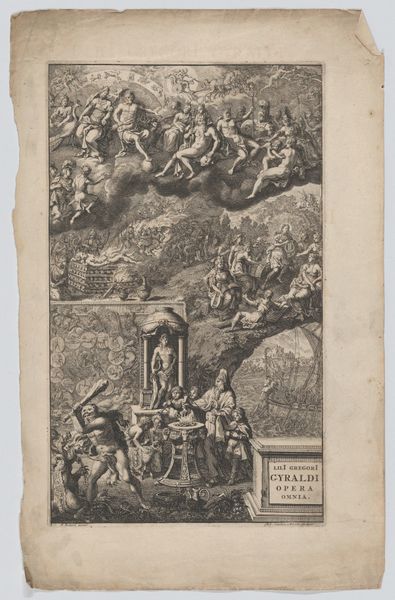 This etching, "Aeneas and Mercury," was created in 1697 by Wenceslaus Hollar. The composition is immediately striking, filled with intricate lines and a dynamic arrangement of figures against a backdrop of classical architecture. Hollar masterfully uses line to create depth and texture, guiding our eyes through the unfolding drama. Mercury hovers in the air, holding his symbolic caduceus, while Aeneas stands below, observing the unfolding scene. The architectural elements—columns, arches, and scaffolding—intersect, constructing a complex visual space which adds to the overall sense of movement. The scene's semiotic structure reveals a tension between divine intervention and human endeavor. The etching technique itself, with its fine, detailed lines, reflects a larger cultural discourse on representation and the power of images. This detail emphasizes not just the aesthetic quality but also highlights the dialogue between classical mythology and the artistic practices of Hollar's time, demonstrating how art can be a site of ongoing interpretation.