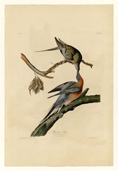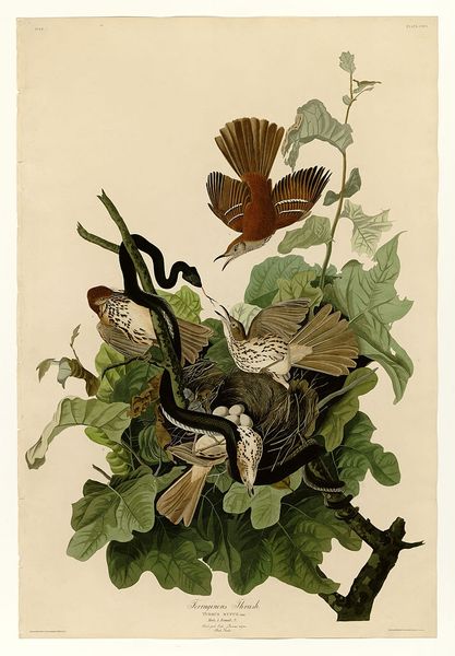 Curator: This is Plate 142, "American Sparrow Hawk," by John James Audubon, rendered in watercolor. Editor: The immediate feeling is… dynamic. The three hawks, the foliage—everything is charged with potential energy, about to burst into motion. Curator: Audubon aimed to capture the spirit of these birds, not just their likeness, at a time when ornithology and art were intertwined with colonial expansion. The romanticized depiction of the natural world often served the interests of settlement and resource extraction. Editor: The rendering of the feathers, look at the meticulous layering of browns and tans creating depth, especially on the hawk perched to the left. The precision borders on obsession! Curator: His work sits within a broader narrative of scientific exploration intertwined with the problematic assertion of dominance over nature and Indigenous lands. The seeming objectivity obscures a loaded, gendered gaze of control. Editor: Perhaps. But I can't help admire how he manipulates value to define form. Notice how he uses backlighting from the top to emphasize the downward momentum. There’s even implied light reflecting off of the hawk’s plumage on the lower right. Curator: Yes, and while appreciating his artistic skill, let’s also contemplate the impact of this representation on perceptions of nature. His vision helped shape—and still shapes—how we see the natural world and our place within it. A perspective that requires careful, critical consideration today. Editor: A valid point. The detail pulls you in, but maybe a broader view can stop you from becoming completely absorbed into its beauty. It leaves you something more than mere aesthetic wonder. Curator: Indeed, the interplay between art, science, and history demands constant re-evaluation. Editor: I leave with renewed attention, looking again at the interplay of texture and movement. Thanks to you, it has shifted the focal point.