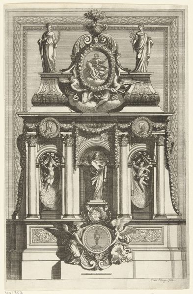 Curator: What strikes me immediately is the dynamism embedded in this still, architectural form. Editor: Yes, the composition is wonderfully energetic for an etching. This is Jean Le Pautre’s "Kansel van voren gezien," created in 1659. We see the pulpit as if facing it head-on. Curator: And the materiality, how the very technique of etching conveys weight and texture—the swirling robes, the carved garlands— it's quite evocative. Consider how he must have handled the copperplate. Editor: Indeed. Note the almost theatrical nature of the pulpit's design. The figures flanking the book stand almost vibrate. The architect, or designer rather, aimed to elicit a reaction, to inspire through visual drama. Curator: There's also a strong interplay of geometric forms at play, that frame the central space occupied by these figural subjects; yet their own contorted and convoluted, swirling nature belies any overt mathematical precision. The symmetry deceives in many ways. Editor: Exactly! And if we think about the artisans who labored to construct this type of pulpit – stonemasons, carpenters, gilders— the object becomes an index of early modern labor. Each angel, each swag and festoon represents hours of skilled work. Curator: Yet, despite the density of the image, and all of that intricate detailing, there's a captivating sense of movement; a certain visual tension sustains itself from the very top crown all the way down to the heads of the sermon listeners on the lower portion. Editor: For me, that tension speaks to the very function of the object depicted; this pulpit mediates communication. The etched print reminds us that religious oration has to connect materially, not just spiritually. Curator: A convincing analysis that adds to my considerations regarding form, thank you. Editor: An insightful reading that enriches my understanding of material’s cultural function.