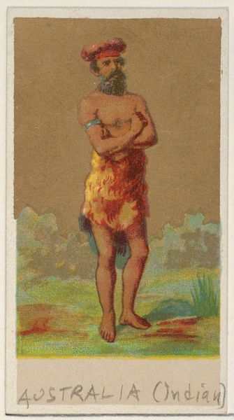 This lithograph was made by Allen & Ginter for their Cigarettes Brands, and it belongs to the Natives in Costume series. The chromolithography process allowed for mass production, turning cultural representation into a commodity. Look closely, and you'll see how the image's composition prioritizes exoticism, reinforcing colonial power dynamics. The texture of the print is smooth, betraying its mass-produced nature. The artist, or more accurately the manufacturer, probably used multiple stones to achieve the full-color image. The image would have been printed, cut, and then inserted into cigarette packs as a collectible item. These cards fueled consumer culture, and simultaneously propagated biased views of indigenous people. Consider the labor involved: from the artists creating the image, to the factory workers printing and packaging it, to the tobacco farmers themselves. This seemingly innocent card is deeply embedded in the social and economic structures of its time. It reminds us that even the smallest objects can carry significant cultural weight.