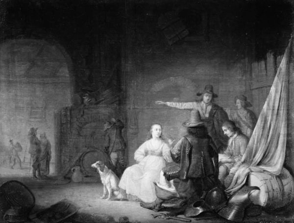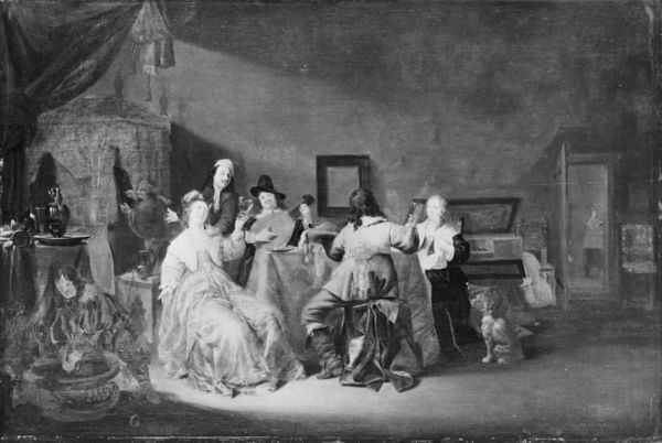 Ignatius van der Beken created this oil painting, Gallant Company on a Terrace, capturing a scene of leisure and social interaction. Looking closely at the material qualities, the painting's surface is built up through layers of brushstrokes, a testament to the artist's skillful manipulation of oil paint. The texture is smooth but with clear differentiation between the matte appearance of textiles, versus the gleaming appearance of the metalwork. The artist employed techniques common to the period, layering glazes to create depth and luminosity in the fabrics, and a sense of realism in the depiction of people and objects. The work’s social significance lies in its portrayal of aristocratic leisure, a lifestyle made possible by the labor and resources of others. The making of such paintings was also enmeshed in a complex system of patronage, skill, and market demand. By considering the materials, techniques, and context, we can appreciate the significance of this painting and the economic conditions that underpin it.