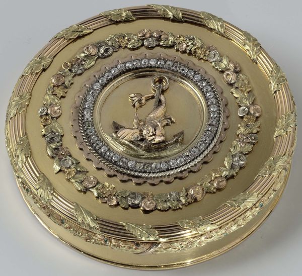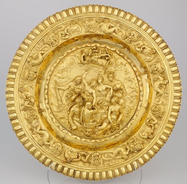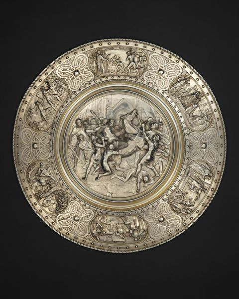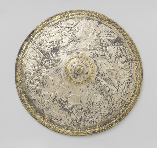 Curator: The gleam of the gold almost obscures the detail. At first glance, it overwhelms, yet invites closer inspection. Editor: This is a decorative charger, entitled "Plateau," created by Elkington & Co. in the 19th century, currently held at The Metropolitan Museum of Art. Curator: It's certainly impressive in scale and execution. That uniform metallic hue flattens the chaotic battle scene depicted, paradoxically lending it a certain decorative charm despite the violence. Are we witnessing a glorified narrative? Editor: Indeed. These banquet dishes, often purely ornamental, were status symbols displaying wealth and celebrating significant historical or mythological events. Notice the figures around the edges—smaller scenes and royal emblems contained in circles and vignettes. These create layers of meaning; power, ceremony, legacy, all meticulously rendered. Curator: Yes, that repetitive application almost resembles coinage in its need to record power. The battle at the center then becomes another attribute of the commissioning royal’s brand, linking him or her to bravery. I can almost taste the echoes of past banquets where tales were told over dishes such as this. Editor: Quite, the plate operates both as a historical record and a cultural artifact, capturing the aspirations of a particular time and place through formal representation. See how the artist employed repoussé and chasing techniques to give it form? The subtle variations in relief create depth and shadows, enlivening the composition. Curator: The composition teems with action. But is the message received without an understanding of these older traditions? It becomes a symbol of ornate excess now, which obscures any intention to commemorate historical significance. It needs to carry more context to resonate emotionally, or perhaps, is the sheer quantity of detail enough to render impact? Editor: I find its allure arises precisely from the complex visual language used in decorative arts. Each element, from the composition to the material, bears symbolic significance—power, glory, historical continuity… all interwoven to convey potent cultural messages. It leaves you contemplating a fascinating interplay between art, power, and social function.