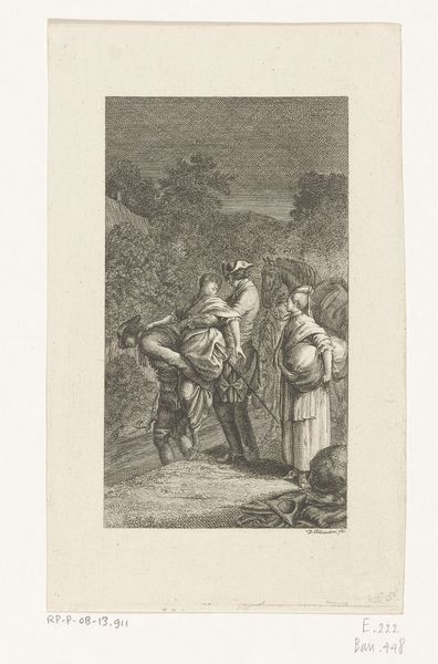 Curator: This etching, rendered in a stark Baroque style, is titled "Abraham speaks to Isaac before the Sacrifice" and dates to 1731. Christian Wilhelm Ernst Dietrich is credited as its author. Editor: A powerful composition, I must say. The immediate impact is one of deep foreboding. There is a clear dramatic tension in the contrasting gestures of the figures—the heavy mood hanging over them seems tangible. Curator: Notice how Dietrich uses line weight and density to create areas of deep shadow and intense highlights. Consider Abraham's upraised hand, which acts as a focal point. Observe, too, how Dietrich articulates a sense of gravity in Isaac's averted gaze. Editor: The piece speaks to inherited trauma. Consider the weight of Abraham's paternal authority—and divine mandate—bearing down on Isaac's subjectivity, trapping him between obedience and existential dread. Doesn't this resonate with intergenerational struggles we see playing out today? Curator: What resonates is how this composition exemplifies the dramatic contrasts inherent in Baroque aesthetics: note the way the chiaroscuro models their bodies, almost theatrical in its intensity. The light emphasizes Abraham's expressive face and commanding stance, and shrouds Isaac’s humanity in shadow. Editor: Right, and to expand on that, Baroque art frequently aimed to evoke profound emotional and spiritual responses. This depiction, steeped in a biblical narrative that challenges the notion of morality itself, evokes not only pity but perhaps also interrogates themes of patriarchal control that pervade Western art history. Curator: Undoubtedly, Dietrich has used line work, scale, and dramatic lighting effects to give form to what can only be defined as a dark theological episode. It is very compelling. Editor: Agreed, it forces us to ask important questions about power, agency, and belief. I think its continued relevance comes down to its unreserved investigation into personal and collective narratives.