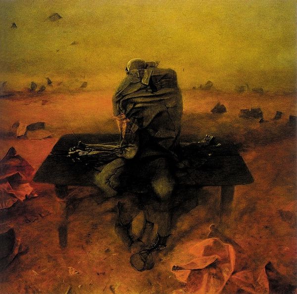 Editor: Here we have an untitled painting by Zdzislaw Beksinski, most likely an acrylic on canvas. The palette is quite muted and sombre, all earth tones with this eerie red focal point at the top. What’s your take on this work? Curator: Considering Beksinski's material practice allows us to interpret the anxiety embedded within this "fantasy-art" style. How does the tangible presence of the materials—the potential thickness of the acrylic, the texture he coaxes from the paint—shape the meaning of the spectral rider and steed? Editor: It feels very textured and built-up, almost sculptural. It adds to the unsettling nature of the image, as though it’s physically decaying before our eyes. Curator: Exactly. The medium itself becomes a vehicle for conveying decay and distress. How might his process—the application, layering, and perhaps even the destruction of the paint—relate to socio-political circumstances he was experiencing? This wasn't just fantasy; the dark, dystopian worlds Beksinski conjured were inevitably entwined with very real fears about authority and ruin, stemming in no small part from life under a communist regime. Editor: So the oppressive atmosphere isn't just aesthetic, but it comes through in how he physically manipulates the materials? That adds another layer to how I see it. Curator: Precisely. Beksinski's Neo-expressionist output transcends simple representation. It speaks volumes about the artist's world, transforming pigment into protest. The 'matter-painting' aesthetic amplifies this – each deliberate daub a conscious challenge. Editor: This lens really transforms how I read this image, it is definitely more charged. Thanks! Curator: Agreed. Examining art this way gives us deeper insight into its making and social resonance.