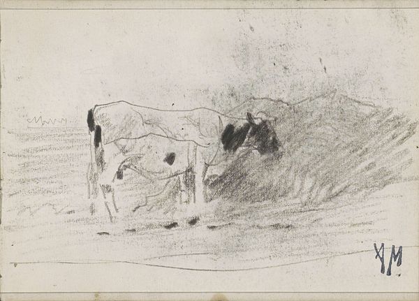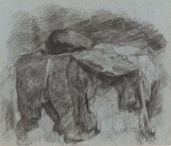 Alexandre-Gabriel Decamps created this drawing, "Two Draft Horses," using charcoal. The composition is dominated by the mass of the two horses, rendered with heavy, dark strokes that contrast with the lighter background wash. The density of the charcoal emphasizes the horses' musculature and bulk. There is a table-like structure to the left of the horses which adds a sense of depth to the composition. Decamp's use of chiaroscuro, with strong contrasts between light and shadow, creates a dramatic, almost theatrical effect. Decamps was known for his Orientalist paintings, but here we see an interest in the Realist tradition, focusing on everyday subjects and the working class. The heavy lines and the subdued palette contribute to a sense of gravity, highlighting the labor and strength of these animals. The visual weight of the horses is undeniable. This physicality, rendered through the materiality of charcoal, emphasizes the tangible, immediate presence of the animals, inviting a contemplation on the intersection of labor, nature, and representation.