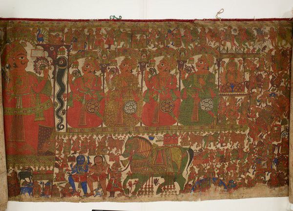 Curator: What strikes me immediately is the visual cacophony, but contained and rhythmic. So many figures delineated in this striking red and black against the undyed cotton. Editor: Indeed. We're looking at a Mata ni Pachedi textile, likely from the 20th century. It’s currently housed here at the Minneapolis Institute of Art, created by members of the Nagri caste. It serves as a portable shrine cloth. Curator: Portable, and utterly compelling in its visual vocabulary. Note how the figures, while numerous, are simplified into near-geometric forms. The overall composition creates an almost dizzying effect of organized chaos. It begs to be deciphered! Editor: Well, the materials are rather simple – cotton that would have been readily available, and then dyes. The process involves resist dyeing and hand-painting. This textile then becomes a sacred space, deployed to facilitate worship where a temple is not available. Curator: Ah, that shifts the way I see it. The folk art style speaks to something immediately accessible, even rudimentary, and it belies the object's sacred function. How does the nature of its making impact its value within the community? Editor: The Nagri caste traditionally served as storytellers and religious performers. Mata ni Pachedi textiles are not simply art objects, but tangible representations of their religious narratives and social identity. The creation and use are intertwined. Curator: So the artistry, then, becomes almost a performative act in itself, imbricated in this broader cycle of religious and social activity. Considering how repetitive patterns and stark color choices are typically read in modern art...the layering of intentions here really does reframe those conventions. Editor: Exactly. When examining art we usually bring our own lens that comes out of education and how we engage the contemporary artworld, but this piece invites us to question conventional wisdom, engaging with a unique form of art and sacred tradition. Curator: Yes, seeing this artwork allows a deep dive into the relationship of its form and ritual purpose, I think that that is vital when studying these forms of ancestral creations. Editor: Agreed. These textiles speak to the beautiful complexity and enduring power of human expression through cloth.