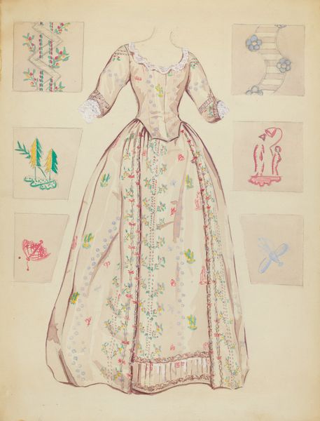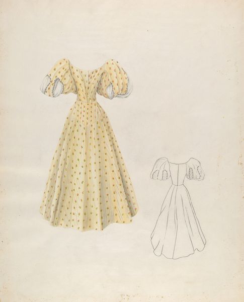 Nancy Crimi created this ‘Ball Dress’ drawing with graphite and watercolor, and it presents a delicate study in form and texture. The light washes of color and the detailed linework invite us to consider the relationship between representation and materiality. The dress, with its floral patterns, suggests a certain historical period, yet the incomplete rendering and the presence of a sketched, less-detailed version beside it complicates any straightforward reading. Crimi's careful attention to the dress’s structure contrasts with the more ephemeral qualities of watercolor. Notice the precision with which she depicts the dress's shape and ornamentation. Ultimately, this artwork destabilizes conventional understandings of dress as mere objects of fashion. Instead, it functions as a site of interplay between artistic form, historical evocation, and the very act of seeing. The tension between the dress’s apparent elegance and the drawing’s quiet introspection leaves us contemplating the layers of meaning embedded within this rendering.