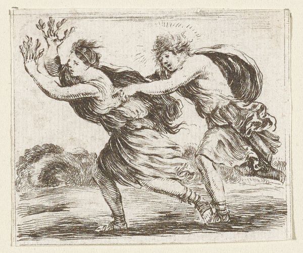 Warner Horstink created this etching, "Landschap met vrouw bij een boomstronk," sometime around the turn of the 19th century. The image presents us with a woman set against a broad landscape. Her back is turned, and her gaze seems directed toward some unseen point in the distance. There's a sense of solitary contemplation here, of a figure embedded within nature yet also somewhat isolated. During this period, ideas about nature were shifting. The Romantics were interested in nature as a sublime and powerful force, a place of refuge and spiritual awakening. Yet the image is also complicated by the woman's partial nudity and her vulnerable stance. Is she simply a figure within the landscape, or is something else at play? Horstink's composition invites us to consider the complex relationship between gender, nature, and the act of looking.