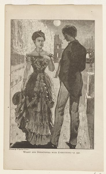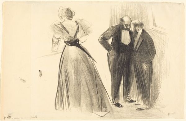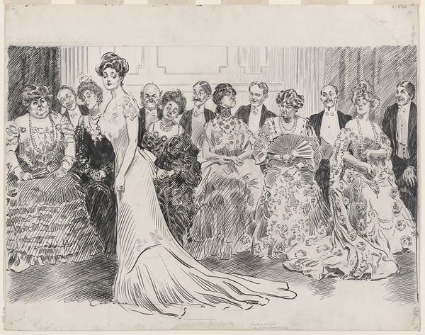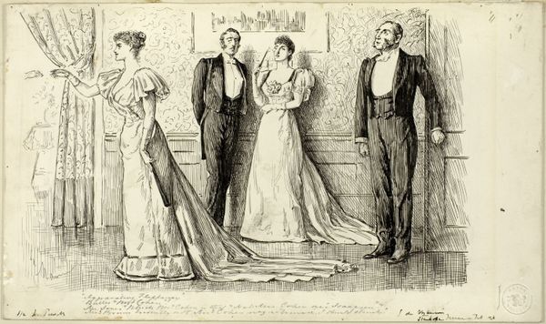 This drawing, "Zusjes in avondkleding bekijken twee jongemannen," was made by Anna Maria Kruijff, in pencil and watercolour. Look how she captures a social scene with so much subtle detail. The whole piece feels like a fleeting moment, rendered with such grace. The use of thin washes and delicate pencil work really creates a sense of lightness. It's not about heavy, bold strokes, but more about these soft, almost whispered lines that give shape to the figures and their fancy dresses. See the way she suggests the folds and frills of the gowns with just a few strokes? It's all about suggestion, leaving space for our imagination. I love how the sketchy quality contrasts with the formality of the scene, it gives the piece a kind of awkward charm. It reminds me a bit of Degas, who had a similar talent for capturing the in-between moments of social life. It’s like a snapshot of a bygone era, full of untold stories and hidden glances.