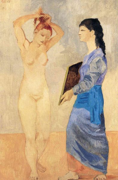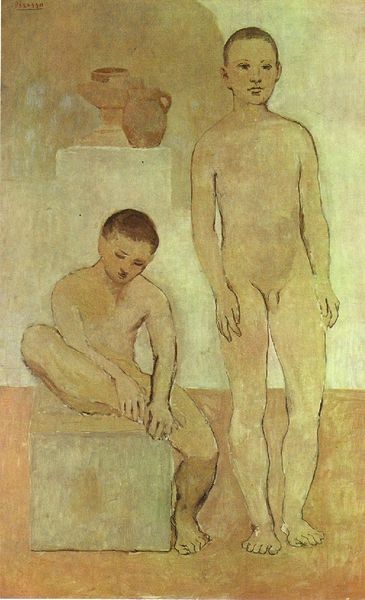 Art Historian: Here we are, gazing at Picasso's "Girl and Goat," painted in 1906. An uncanny scene in oil. Editor: Yes, the girl seems to have just strolled straight out of some sun-drenched Mediterranean landscape. But her calm is kind of undercut by the goat and the other child, who appears to be wearing a pot on its head... What's going on in this artwork? What does it all mean? Art Historian: Ah, "mean" is such a bossy word. What it whispers to me is far more interesting. There's this primal connection to nature, right? Think back to ancient myths – nymphs, satyrs, human/animal blends, all frolicking in a pre-industrial paradise. I picture Picasso almost longing for some ancient past. A little saucy if you consider his reputation perhaps? Editor: Definitely an interesting way to interpret it. Although you're saying this picture wasn't necessarily what it seems on the surface? Art Historian: Well my clever art sleuth, could this even be Picasso wrestling with his identity as a painter? Consider those slightly awkward angles, the flattening of the figures. He’s not quite ready to completely break with form just yet, still clinging to it while also clearly trying to tear free. See how the background flattens almost, with colors fighting with form.. Does it resonate? Editor: Oh, wow, that is very fascinating, what with it appearing to be a sort of cross between genres and eras, perhaps, or as if everything is taking place simultaneously... Art Historian: Right? The "girl" looks both innocent and a bit worldly, if that makes any sense... This piece makes me wonder how much we are creatures of both nature and thought... Does that animal somehow echo who she is within, what part of her that’s human and goat? What I see now has altered so drastically. Art, such a mirror!