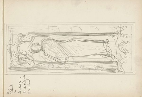 Curator: This is Antoon Derkinderen's "Design for a window with personification of the North Sea," made between 1900 and 1903, rendered in pencil on paper. Editor: It's quite stark, isn't it? Almost like an anatomical drawing. There’s a very strong sense of classical influence, I suppose relating to his focus on figuration and line here. Curator: Precisely. As a design for a window, consider the function. Light would have streamed through these precise lines, interacting with the very structure of the window. What statement might the materiality of the design process be trying to communicate, do you think? Editor: Well, Derkinderen situates this piece right at the nexus of industrial production and artistry. By invoking classical themes in a decidedly modern style he really does question our contemporary ideas about Dutch identity and internationalization through visual forms. You almost have to wonder what role gender plays, with a reclined male as the key visual anchor? Curator: That’s fascinating. Gender indeed often served as a loaded concept during this era, linked to narratives of strength and national identity. You’re making me rethink the original use! This was, as we know, intended as the first stage of a physical window, it is essentially a material object itself. I find the materiality—the pencil strokes, the texture of the paper—almost speak of labor and deliberate construction processes Editor: I think that reading into labor and social identity is important! He's evoking a kind of raw power, both in the North Sea and in this figure. How might his identity—being Dutch—color this representation, I wonder? How did Dutch laborers conceptualize their engagement with resources—the sea specifically, and even industrialization, perhaps—at that time? Curator: Absolutely! Contextualizing the creation around available resources of the period opens some doors. Consider the quality of the pencil available in that era and compare its production with materials available now. How does the creation reflect those constraints? Editor: Those parameters really anchor Derkinderen in his particular moment. Thinking about identity in terms of nationality, gender, and class gives the window new context to understand. Curator: Indeed, from considering resources to exploring themes, both elements have unlocked insights today! Editor: Truly a conversation to sea.