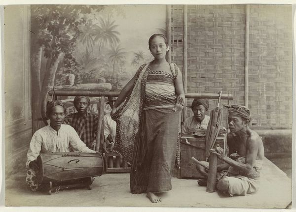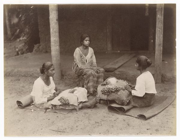 Curator: What a beautifully composed image. It's a gelatin-silver print by W.L.H. Skeen & Co., titled "Street Jewellers in Sri Lanka," dating roughly between 1862 and 1903. Editor: The scene has an almost solemn feel, don't you think? The textures seem rich; you can practically feel the weight of the tools and materials in the subjects' hands. There's such palpable concentration in their faces. Curator: The photo provides a fascinating window into the commercial landscape of colonial-era Sri Lanka. We are observing labor, commodification, and local artistry outside a formal institution. I want to know about their social position. Where would this scene take place? Editor: Precisely. The socio-economic implications of such a scene displayed and consumed are critical. These types of staged photos of the period were highly popular. It gives us an idea of how the West consumed the orient as an easily digestible narrative. The materials are not being celebrated on their own terms. They become elements in a greater scheme of perceived otherness. Curator: That reading sheds light on how we continue to grapple with that historical imagery. The choice to present it as such shapes viewers’ preconceptions of both culture and commodity. Editor: It absolutely directs the viewers to otherness and wonder. Curator: The formal composition—the placement of the subjects, the tables, even the light—serves that purpose. This presentation style makes the labor and craft easily categorized into the exotic experience of this scene. Editor: I see now the artist may have shaped that visual consumption more pointedly. I appreciate the complexities here. Curator: It reminds us of the layered relationships at play in even a seemingly straightforward portrait. Thank you for your considerations!