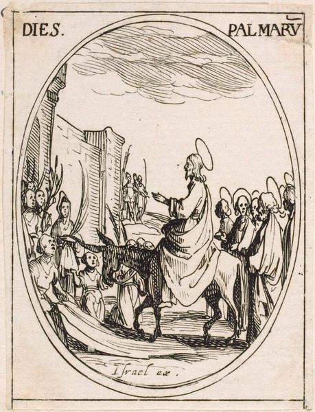 Editor: This is Jacques Callot's "Saint Gumtramnus", an etching. The figures seem to emerge from the scene, defined by crisp lines. What kind of cultural memory does this image evoke for you? Curator: The linear precision indeed invites a closer look at the symbols. Note the saint's halo and the supplicant posture of the figure before him. The saint proffers what seems to be a chain, a potent symbol in many cultures. Editor: What does the chain represent? Curator: Chains can signify bondage, but also connection. Here, given the religious context, I wonder if it represents spiritual release or perhaps a link to divine favor. Editor: So it’s not just about the literal depiction, but also its cultural weight? That’s really insightful. Curator: Precisely. Visual symbols carry layers of cultural memory and continuity, informing our understanding of the artwork's meaning.
