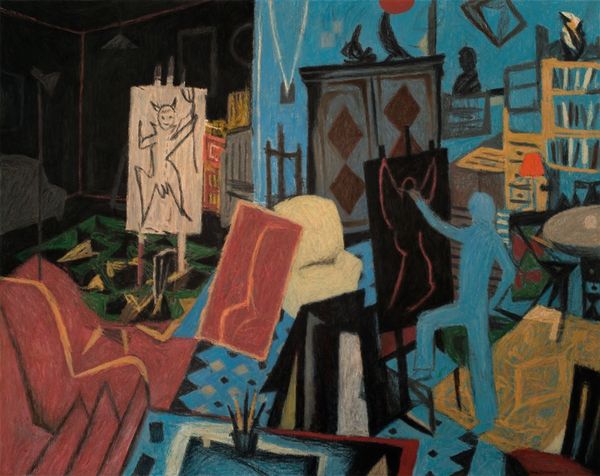 Curator: This is "Green Studio" by Iwo Zaniewski. Looking at the confident strokes of charcoal and possible use of acrylic on canvas, what's your first impression? Editor: There's an unsettled atmosphere created by the expressionistic strokes. I get the feeling of being overwhelmed, claustrophobic maybe? The colour palette adds to that unease. Curator: I agree, there is that edginess created by the materials and how they're handled. This reminds me how the means of production have historically dictated aesthetic values. The choice of materials isn’t incidental; they speak to accessibility and artistic intent. Zaniewski appears to want us to focus on this process of artmaking. Editor: That's a point. Given that art galleries and institutions dictate the course of art making, is Zaniewski playing on what might constitute a good artwork? The figuration here could represent a rejection of market values perhaps. Curator: Could be. By drawing attention to the materiality and labour involved, the artist also highlights consumption habits—our desires for these objects. It also challenges what is "high" and "low" art. Editor: Absolutely, and considering Zaniewski’s other work which shows a similar approach, perhaps this subversion is intended? It raises questions about authenticity in the art world, as well as challenging us to appreciate creative labour. Curator: I see this work more clearly now—you are right, the piece's effect lies in its challenging materiality and the artist's hand. Editor: The public’s reception surely depends on recognizing that loaded relationship. The institution, after all, legitimizes artwork, so there’s that power dynamic always at play. Curator: Well said. It's this intersection of material reality and societal influence that makes it such a compelling piece, even if unsettling. Editor: Indeed, it seems Zaniewski is reminding us to look critically at the stage upon which art operates.