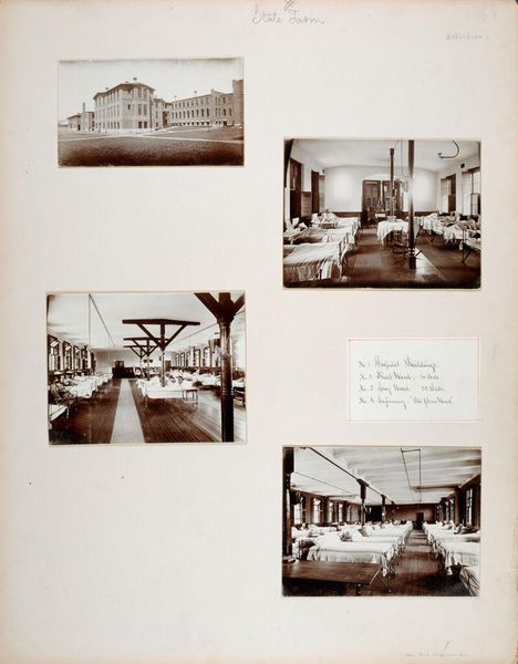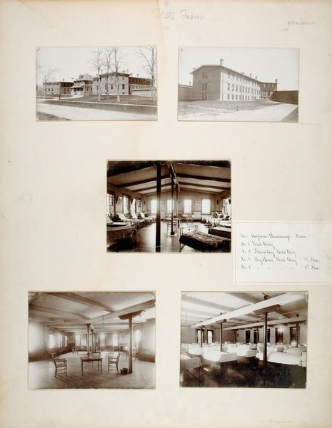 Editor: This photographic album page titled "Charity, Public: United States. Massachusetts. Bridgewater. State Farm" by Bass Photo shows several views of what appears to be a state-run institution. The images evoke a sense of order and perhaps some isolation. What symbols do you see at play here? Curator: The State Farm itself, the large building in several images, acts as a symbol of institutional power and societal control. The rows of beds and machinery signify regimentation. Do you think this arrangement promotes charity, or something else? Editor: It’s interesting that charity and control can be so closely linked visually. I hadn’t considered how those symbols might interact. Curator: Consider how the visual language used here shapes our understanding of “charity.” It invites us to question the underlying assumptions and power structures inherent in acts of public assistance. What have you learned? Editor: I now see how the physical arrangements depicted here subtly communicate the values and power dynamics within the institution.