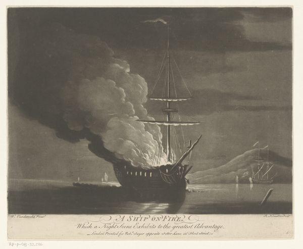 Curator: Looking at this engraving, my first impression is dominated by a sense of chaotic energy and destructive force. Editor: That’s exactly the sentiment Franҫois Magneé aimed to capture in "The Gunboat Exploding of Jan van Speijk, 1831," now hanging here at the Rijksmuseum. He made this print, an engraving actually, of the heroic yet controversial death of Jan van Speijk. Curator: Controversial indeed. An explosive end to his life, dramatically portrayed here through jagged shards and plumes of smoke. I see it echoing other Romantic depictions of disaster, like shipwrecks or battles consumed by chaos. The etching captures a moment of extreme nationalistic fervor, almost feverish, doesn't it? Editor: Absolutely, there is that feverish aspect! The event itself quickly became a symbol in the young Kingdom of the Netherlands – of unwavering patriotism and sacrifice against the backdrop of Belgian independence aspirations. It was the age of nascent nation-states needing iconic martyrs, someone to crystallize their collective identity around. Curator: Precisely. And even in this grayscale image, that collective identity is vividly captured. The stark contrast suggests to me a struggle, the bright burst against the subdued greys mirroring the tension between patriotic glory and violent demise. I wonder about the immediate emotional effect it had; whether its impact rested on immediate horror or, perhaps more subtly, on a gradual heroic romanticizing of van Speijk's final act. Editor: Both, I think. But let’s consider its circulation. Engravings were mass-produced images; think proto-internet memes. They appeared in homes, in taverns... they quickly normalized the image, reinforcing state-sanctioned narratives about duty. It’s this distribution that helped cement the political meaning for an entire generation. Curator: Ah yes. Its ubiquity almost transcends the specific moment, it becomes a timeless expression of self-sacrifice, repurposed for diverse anxieties across the following decades, almost devoid of specific narrative constraints. Editor: In many ways, the print is an artifact demonstrating how visual propaganda functions, distilling complex socio-political events down into easily digestible heroic narratives. Curator: Thank you. Looking back at Magneé’s work with this in mind gives me so much to reconsider about both image and its complex reception history. Editor: And for me, that visual reminder of just how strategically chosen are symbols for forging communal consciousness is profoundly significant.