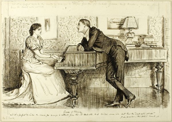 Editor: This ink drawing is entitled "The Proposal" by Charles Dana Gibson. The figures feel a bit theatrical, like actors frozen mid-scene. How might we begin to unpack its meaning? Curator: Let's consider the formal elements. Notice the artist’s sophisticated use of line. It is economical, yet descriptive. How does Gibson use line to define form and create tonal variation? Editor: Well, the density of hatching seems to indicate depth and shadow, particularly in the gentleman’s suit, making him feel more imposing. Curator: Precisely. The strong verticals and diagonals created by the hatching imbue the scene with a sense of restrained energy. And the composition, focusing on these three figures within this enclosed space, how do you interpret its effect on the narrative? Editor: I see your point. It directs our eye and emphasizes their relationships and unspoken anxieties. Do you think the lines forming the curtains have any symbolism? Curator: Observe the tension between the rigidity of the architectural setting, formed through long parallel lines, and the softness of the figures achieved by more varied, broken strokes. Is it too obvious a dichotomy, perhaps indicating conflict between expectations and personal feelings? Editor: So, form dictates feeling. Seeing how deliberately he manipulates line really reframes how I understand the image. It becomes less about sentimentality and more about… visual architecture? Curator: Indeed! Appreciating the structural components provides insight into both surface and depth, both narrative and form. A dialectic for greater art comprehension, I submit!