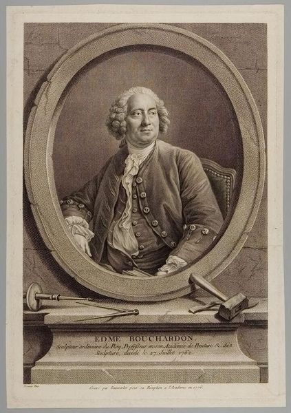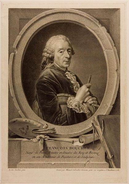 Editor: Here we have Manuel Salvador Carmona’s portrait of François Boucher. I’m struck by the detail in the engraving – you can almost feel the texture of his velvet coat! What’s your perspective on this work? Curator: Consider the engraving process itself. The labor, the skill required to translate Boucher's likeness into a reproducible image. How does this impact our understanding of Boucher's fame and the consumption of his image? It democratizes access, doesn't it? Editor: So, it's not just about Boucher as an individual, but the entire system that allowed his image to circulate. Curator: Precisely. We must also remember the engraver's labor, often unacknowledged. What does Carmona's role in this tell us about the hierarchy of artistic production at the time? Editor: That's a totally different way of seeing it; it’s about the means of production, not just the subject. Thanks!