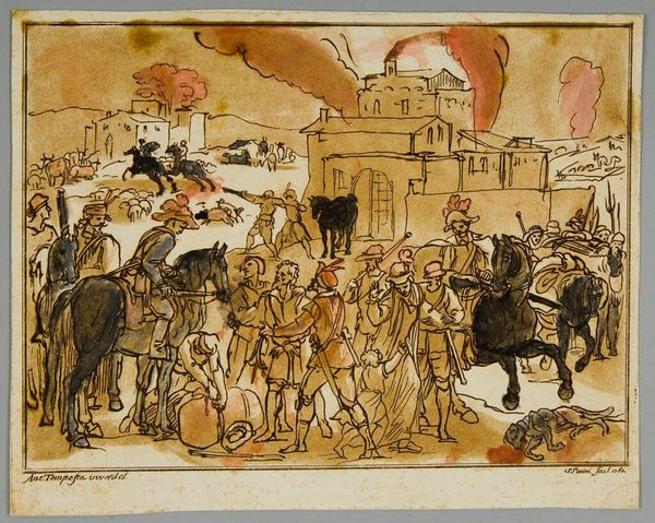 William James Glackens created this work, titled '1911 For the Championship of the Backlot League', using ink and crayon. The work immediately presents as a flurry of chaotic energy. We are thrown into the center of a boisterous scene: a football game amidst the backdrop of a city under construction. The composition is densely populated, but notice how Glackens uses the figures to create directional lines that guide our eyes across the space, generating a sense of depth and movement. He employs a limited color palette to maintain visual coherence, with strategic splashes of red to punctuate the scene and draw our attention to key areas of action. Consider also the unfinished quality of the sketch-like lines, which function as a semiotic code. They evoke a sense of immediacy and dynamism that perfectly captures the raw energy of urban life and the frenetic pace of modern sport. The lack of detail challenges our assumptions about what constitutes a finished work of art. Glackens presents a world in perpetual motion, a state of becoming rather than being.
